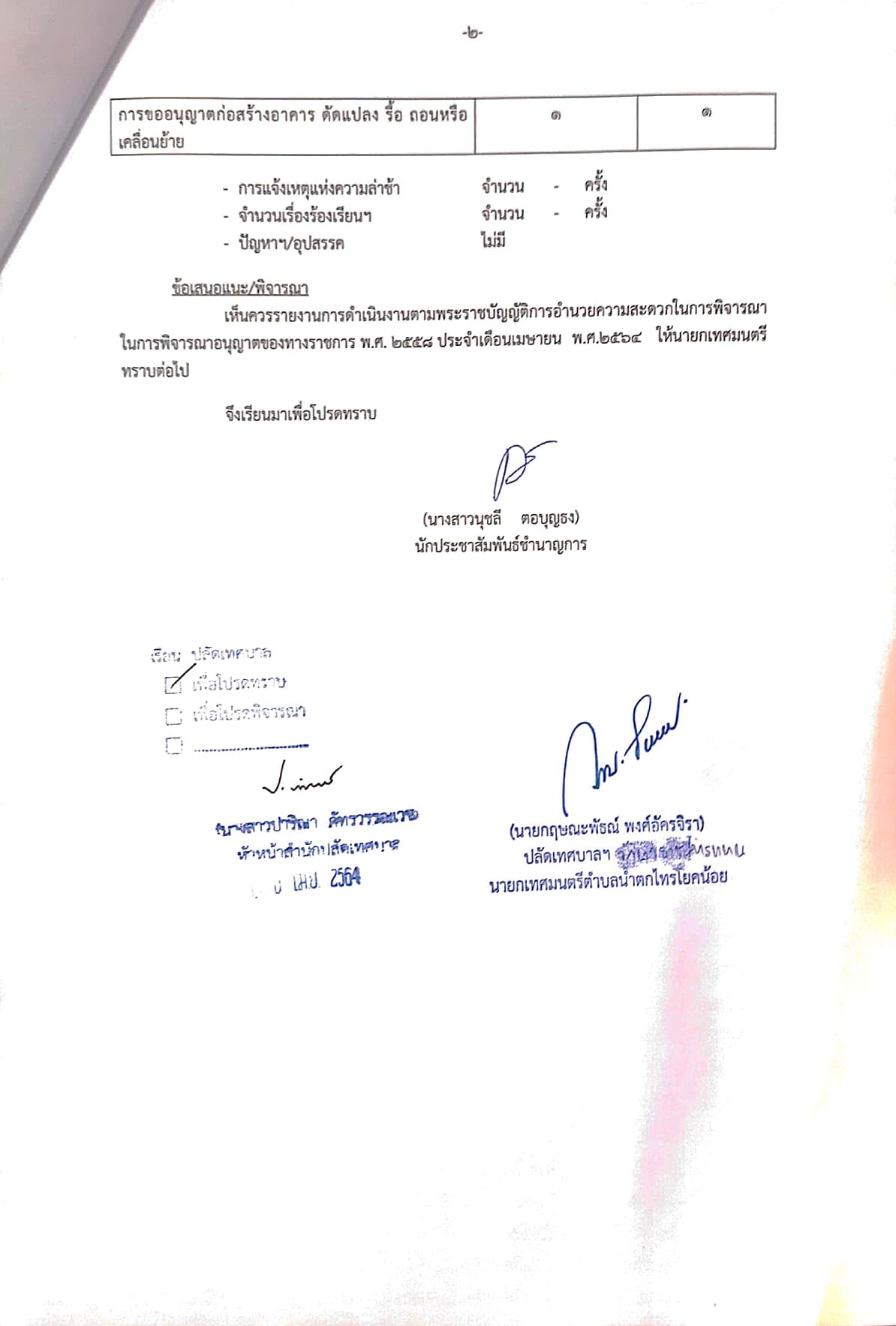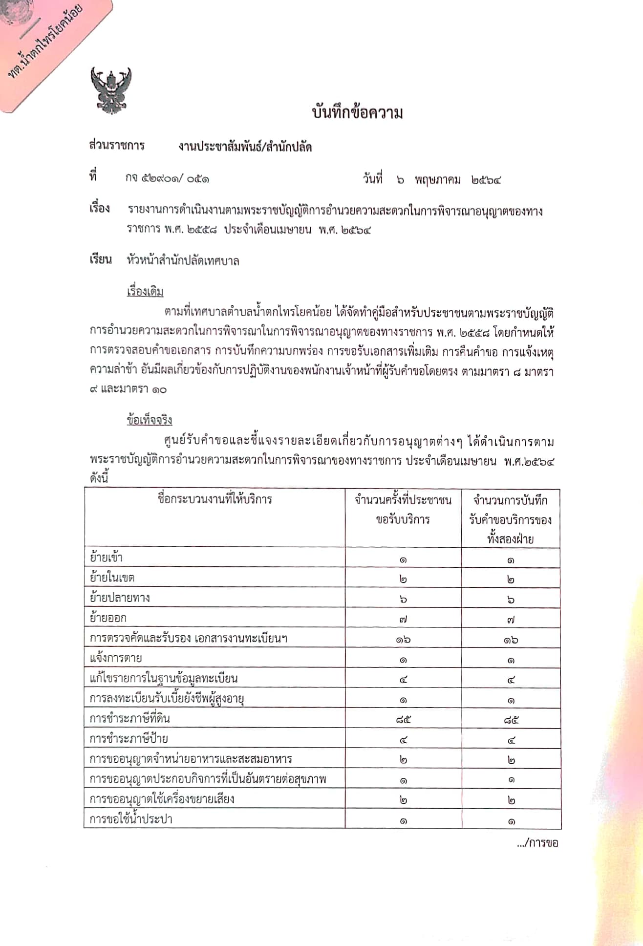 รายงานการดำเนินงานตามพระราชบัญญัติการอำนวยความสะดวกในการพิจารณาอนุญาตทางราชการ พ.ศ.2558 ประจำเดือน เม.ย. 64