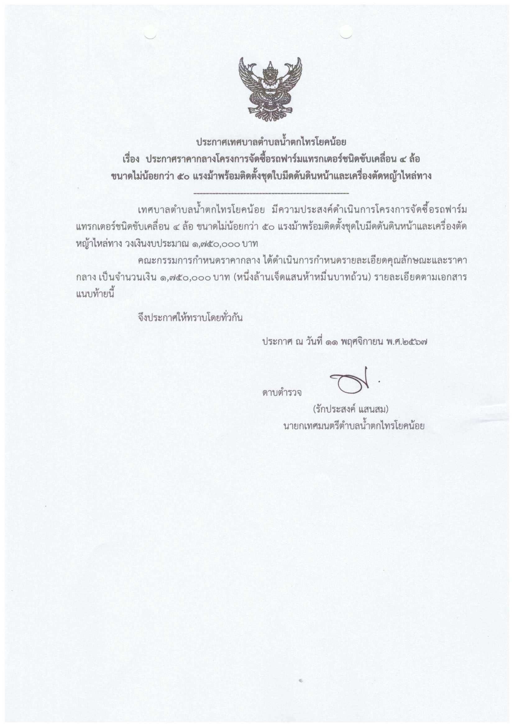 ประกาศราคากลางโครงการจัดซื้อรถฟาร์มแทรกเตอร์ชนิดขับเคลื่อน 4 ล้อ ขนาดไม่น้อยกว่า 50 แรงม้าพร้อมติดตั้งชุดใบมีดดันดินหน้าและเครื่องตัดหญ้าไหล่ทาง