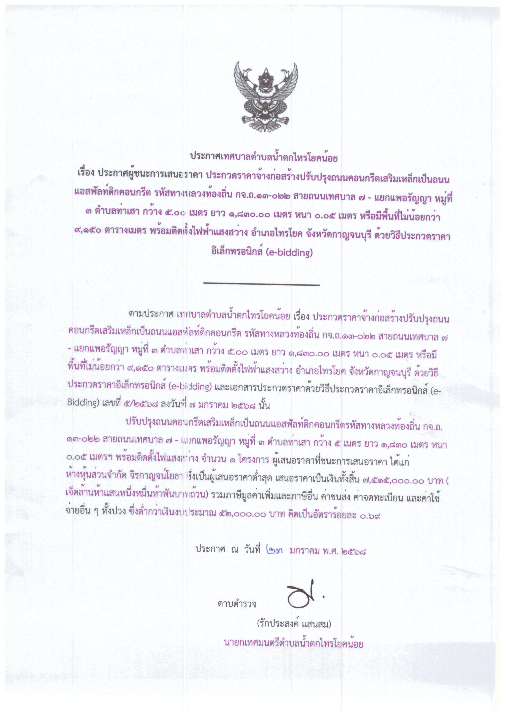 ประกาศผู้ชนะการเสนอการเสนอราคา ประกวดราคาจ้างก่อสร้างปรับปรุงถนนคอนกรีตเสริมเหล็กเป็นถนนแอสฟัลท์ติกคอนกรีต รหัสทางหลวงท้องถิ่น กจ.ถ.13-022 สายถนนเทศบาล 7 - แยกแพอรัญญา หมู่ที่ 3 ตำบลท่าเสา พร้อมติดตั้งไฟฟ้าแสงสว่าง อำเภอไทรโยค จังหวัดกาญจนบุรี ด้วยวิธีประ
