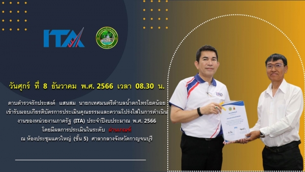 ดาบตำรวจรักประสงค์ แสนสม นายกเทศมนตรีตำบลน้ำตกไทรโยคน้อย รับมอบรางวัลหน่วยงานที่มีผลการประเมินคุณธรรมและความโปร่งใส่ในการดำเนินงานของหน่วยงานภาครัฐ (ITA) ประจำปี 2566 ซึ่งมีผลการประเมินในระดับ ผ่านเกณฑ์ โดยมี นายอธิสรรค์ อินทร์ตรา รองผู้ว่าราชการจังหวัดกาญจนบุรี เป็นประธานมอบเกียรติบัตรในครั้งนี้ ณ ห้องประชุมแควใหญ่ ชั้น 5 ศาลากลางจังหวัดกาญจนบุรี