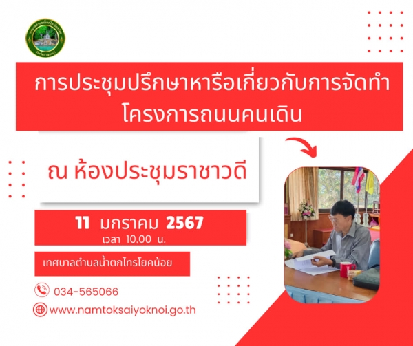 11/1/2567 เวลา 10.00 น. ดาบตำรวจรักประสงค์ แสนสม นายกเทศมนตรีตำบลน้ำตกไทรโยคน้อย เป็นประธานการประชุมปรึกษาหารือเกี่ยวกับการจัดทำโครงการถนนคนเดิม ประจำปีงบประมาณ 2567 ณ ห้องประชุมราชาวดี ชั้น 2 โดยมีคณะผู้บริหาร สมาชิกสภาเทศบาล หัวหน้าส่วนพร้อมด้วยเจ้าหน้าที่ที่เกี่ยวข้องเข้าร่วมประชุม
