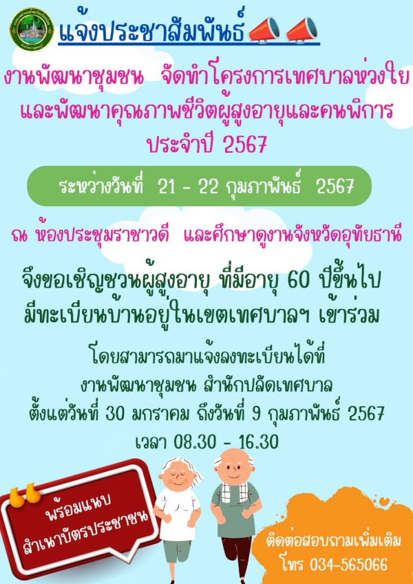 ขอเชิญชวนผู้สูงอายุ ที่มีอายุ 60 ปีขึ้นไปมีทะเบียนบ้านอยู่ในเขต ทต.น้ำตกไทรโยคน้อยเข้าร่วมโครงการฯ
