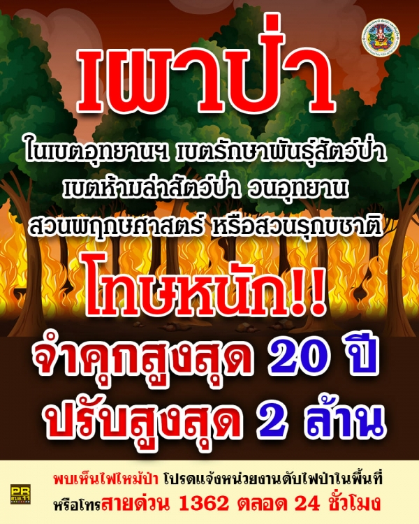 เผาป่าโทษหนัก!!!จำคุกสูงสุด 20 ปี ปรับสูงสุด 2 ล้านบาท