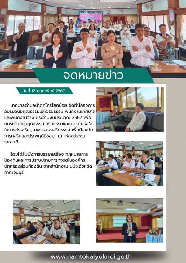 วันที่ 12 กุมภาพันธ์ 2567 เวลา 08.30 น. เทศบาลตำบลน้ำตกไทรโยคน้อย จัดทำโครงการอบรมวินัยคณธรรมและจริยธรรม ผู้บริหาร สมาชิกสภา พนักงานเทศบาลและพนักงานจ้าง ประจำปีงบประมาณ 2567 โดยมีกลุ่มเป้าหมายคือ คณะผู้บริหาร สมาชิก พนักงานเทศบาลและพนักงานจ้างของเทศบาล จำนวน 60 คน มีวัตถุประสงค์เพื่อยกระดับวินัย คุณธรรม จริยธรรม และความโปร่งใสของเทศบาลตำบลน้ำตกไทรโยคน้อย และเพื่อป้องกันการทุจริตและประพฤติมิชอบต่อการปฏิบัติงาน และท่านนานยกได้มอบนโยบาย No Gift Policy ให้ถือปฏิบัติอย่างเคร่งครัด ณ ห้องประชุมราชาวดี ชั้น 2 สำนักงานเทศบาลตำบลน้ำตกไทรโยคน้อย