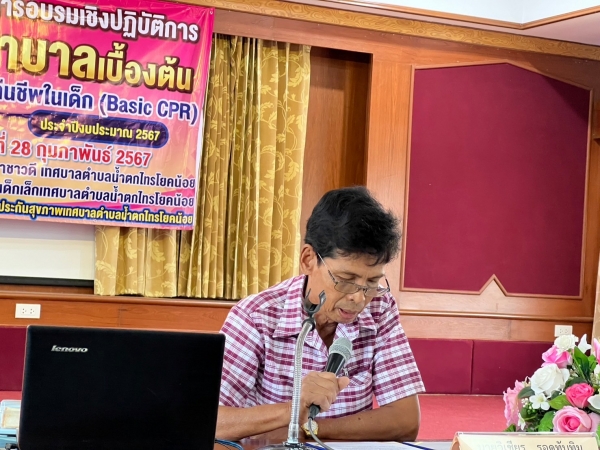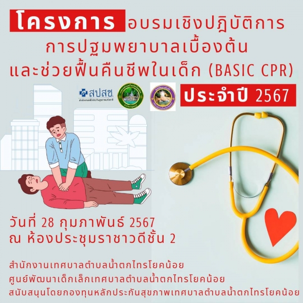 การอบรมเชิงปฏิบัติการโครงการการปฐมพยาบาลเบื้องต้นและการช่วยฟื้นคืนชีพในเด็ก (BASIC CPR) จัดโดยศูนย์พัฒนาเด็กเล็กเทศบาลตำบลน้ำตกไทรโยคน้อย ในวันพุธที่ 28 กุมภาพันธ์ 2567 ตั้งแต่เวลา 09.00 น. ณ ห้องประชุมราชาวดี ชั้น 2 ซึ่งได้รับสนับสนุนจากกองทุนหลักประกันสุขภาพเทศบาลตำบลน้ำตกไทรโยคน้อย โดยมีวิทยากรจากมูลนิธิกู้ภัยกาญจนบุรีศูนย์ไทรโยคน้อย