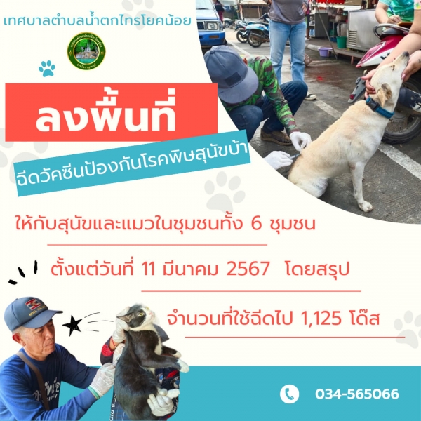 งานสาธารณสุข เทศบาลตำบลน้ำตกไทรโยคน้อย ได้ลงพื้นที่ฉีดวัคซีนป้องกันโรคพิษสุนัขบ้าให้กับสุนัขและแมว ในชุมชนทั้ง 6 ชุมชน โดยลงพื้นที่ฉีดวัคซีนให้กับสัตว์เลี้ยง ตั้งแต่วันที่ 11 มีนาคม 2567 รวมยอดสรุปใช้วัคซีนไปทั้งสิ้น 1,125 โด๊ส
