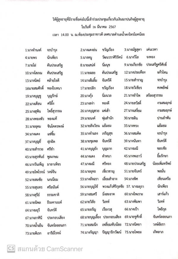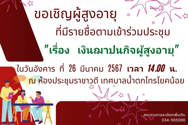 ขอเชิญผู้สูงอายุที่มีรายชื่อ เข้าร่วมประชุมเพื่อหารือเกี่ยวกับเรื่อง "เงินฌาปนกิจผู้สูงอายุ"