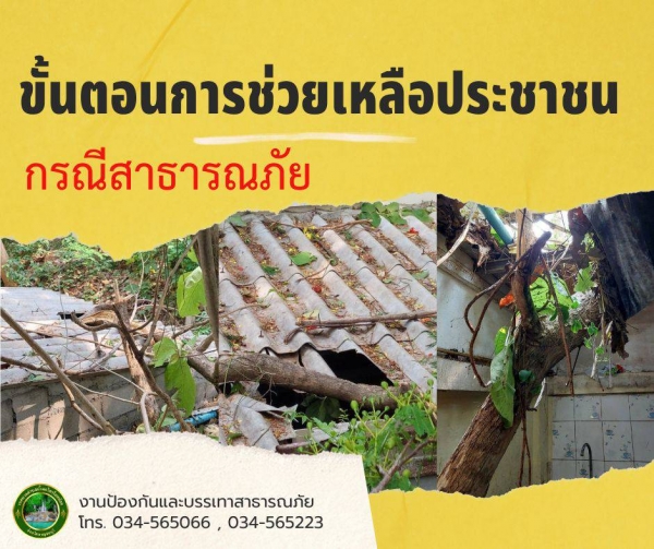 ขอให้ผู้ประสบสาธารณภัย (วาตภัย อุทกภัย อัคคีภัย) ที่มีผลกระทบทำให้ที่อยู่อาศัย และทรัพย์สินเกิดความเสียหาย สามารถยื่นคำร้องขอรับความช่วยเหลือได้โดยมีขั้นตอนดังนี้