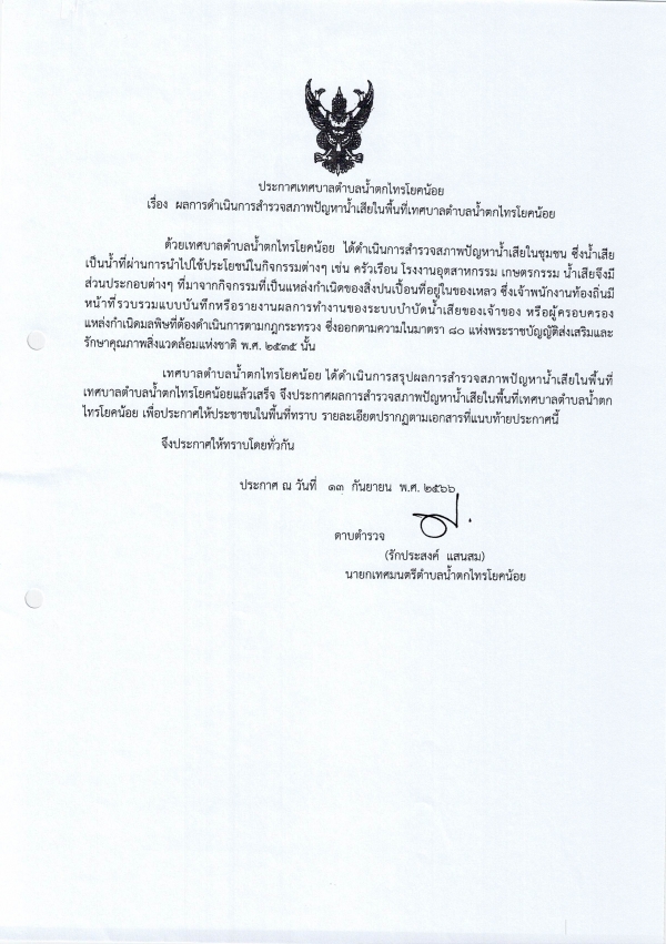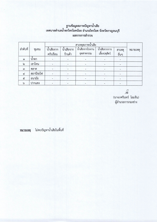 เรื่องผลการดำเนินการสำรวจสภาพปัญหาน้ำเสียในพื้นที่เทศบาลตำบลน้ำตกไทรโยคน้อย