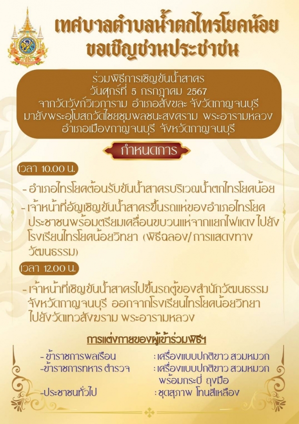 *เทศบาลตำบลน้ำตกไทรโยคน้อย ขอเชิญชวนประชาชน ร่วมพิธีการเชิญขันน้ำสาคร เพื่อจัดทำน้ำพระพุทธมนต์ศักดิ์สิทธิ์ เนื่องในโอกาสปีมหามงคล วันเฉลิมพระชนมพรรษาพระบาทสมเด็จพระเจ้าอยู่หัว ครบ 6 รอบ 28 กรกฎาคม 2567