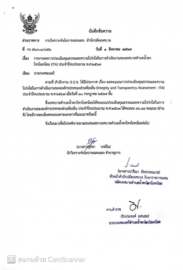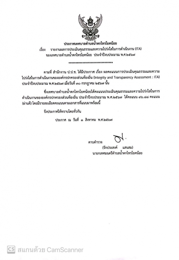 ตามที่ สำนักงาน ป.ป.ช. ได้มีประกาศ เรื่อง ผลคะแนนประเมินคุณธรรมและความโปร่งใสในการดำเนินงานของ อปท. (Integrity and Transarency Assessment : ITA) ประจำปีงบประมาณ พ.ศ.2567 เมื่อวันที่ 30 กรกฎาคม 2567 นั้น