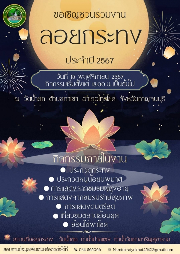 เทศบาลตำบลน้ำตกไทรโยคน้อย ขอเชิญเที่ยวงาน “ประเพณีลอยกระทง ประจำปี พ.ศ.2567” ในวันศุกร์ ที่ 15 พฤศจิกายน 2567 ณ วัดน้ำตก ตำบลท่าเสา อำเภอไทรโยค จังหวัดกาญจนบุรี ตั้งแต่เวลา 18.00 น. เป็นต้นไป กิจกรรมภายในงาน -ประกวดกระทง -ประกวดหนูน้อยนพมาศ -การแสดงจากชมรมผู้สูงอายุ -การแสดงจากชมรมรักษ์สุขภาพ -การแสดงดนตรีสด -เที่ยวชมตลาดย้อนยุค -ช้อนไข่พาโชค