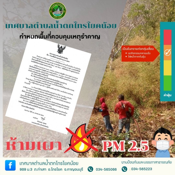 หากพบเห็นการเผาสามารถแจ้งได้ที่งานป้องกันและบรรเทาสาธารณภัย เทศบาลเทศบาลตำบลน้ำตกไทรโยคน้อย หมายเลขโทรศัพท์ 034-565223 ตลอด 24 ชั่วโมง