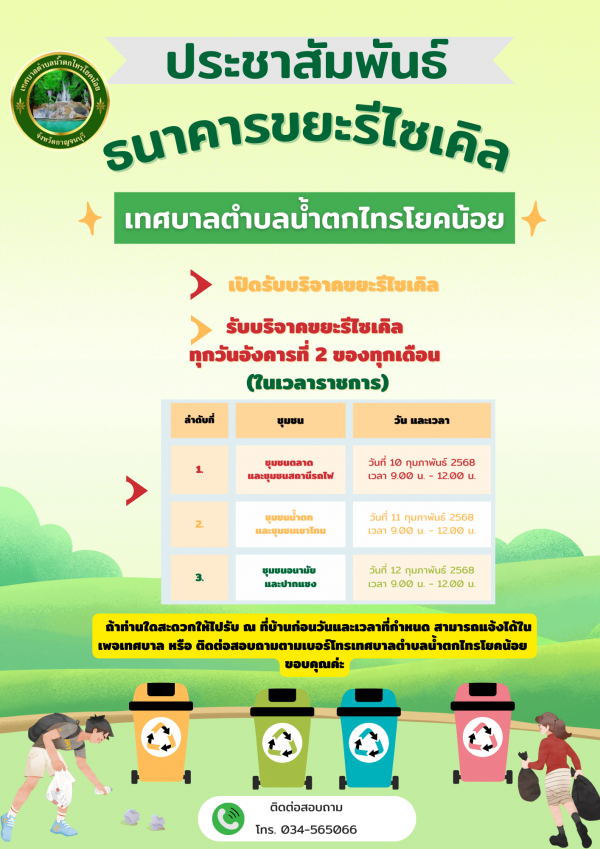 งานสาธารณสุข เทศบาลตำบลน้ำตกไทรโยคน้อย แจ้งกำหนดการออกรับบริจาคขยะ ภายใต้โครงการธนาคารขยะรีไซเคิล ตามกำหนดการแจ้งประชาสัมพันธ์ดังนี้