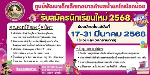 เรื่อง การเปิดรับสมัครเด็กเล็กเข้าเรียน ในศูนย์พัฒนาเด็กเล็กเทศบาลตำบลน้ำตกไทรโยคน้อย ประจำปีการศึกษา 2568