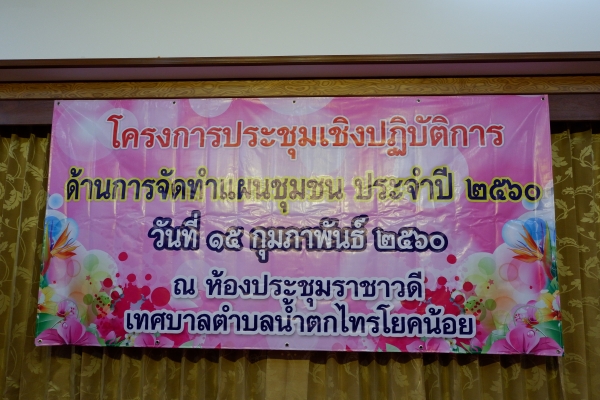 วันที่ 15 กพ 60 เวลา 09.00 น. โครงการประชุมเชิงปฏิบัติการ ด้านการจัดทำแผนชุมชน ประจำปี 2560 โดย ท่านนายกสัจจา ฝุกฝัด นายกเทศมตรี เป็นประธานเปิดการอบรม ณ ห้องประชุมราชาวดี เทศบาลตำบลน้ำตกไทรโยคน้อย