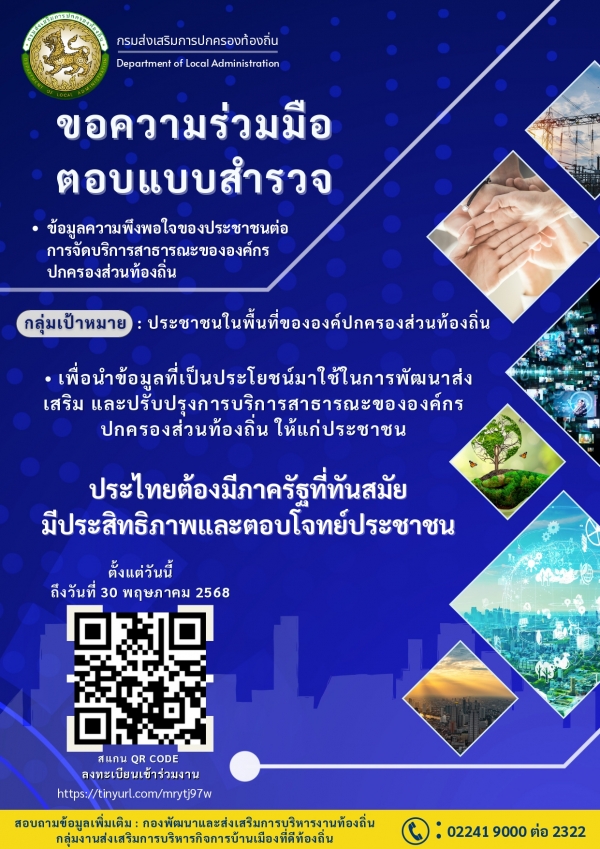 ขอความร่วมมือ ประชาชนตอบแบบสำรวจ ประเมินความพึงพอใจของประชาชน ต่อการให้บริการสาธารณะขององค์กรปกครองส่วนท้องถิ่น เพื่อนำข้อมูลที่เป็นประโยชน์มาใช้ในการพัฒนาส่งเสริมและปรับปรุงการบริการสาธารณะขององค์กรปกครองส่วนท้องถิ่น ให้มีประสิทธิภาพตอบโจทย์ประชาชน ตั้งแต่บัดนี้ ถึงวันที่ 30 พฤษภาคม 2568