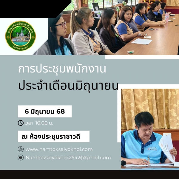 ในวันศุกร์ที่ 6 มิถุนายน 2568 เวลา 10.00 น. เทศบาลตำบลน้ำตกไทรโยคน้อย จัดประชุมหัวหน้าส่วนราชการ พนักงานเทศบาล ลูกจ้าง พนักงานจ้าง ณ ห้องประชุมราชาวดี