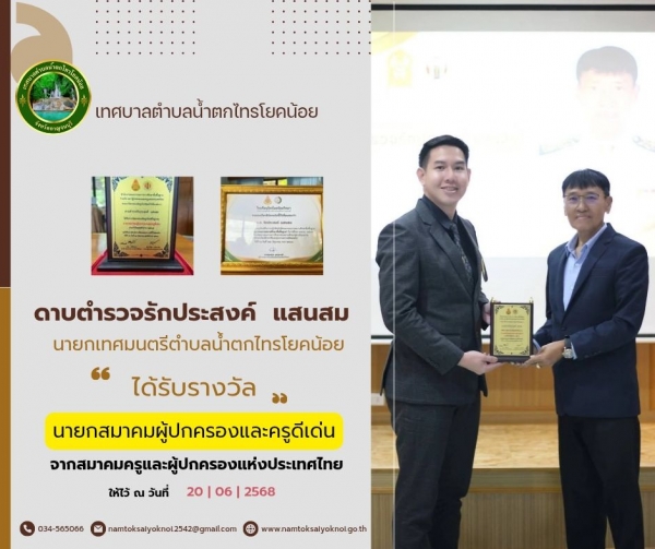 สำนักงานคณะกรรมการการศึกษาขั้นพื้นฐาน ร่วมกับ สภาผู้ปกครองแห่งประเทศไทย ขอมอบโล่ยกย่องเชิดชูเกียรติคุณ ให้ ดาบตำรวจรักประสงค์ แสนสม นายกเทศมนตรีตำบลน้ำตกไทรโยคน้อย ได้รับรางวัลยกย่องเชิดชูเกียรติในฐานะ "นายกสมาคมผู้ปกครองและครูดีเด่น"