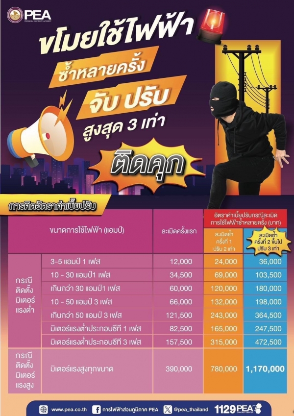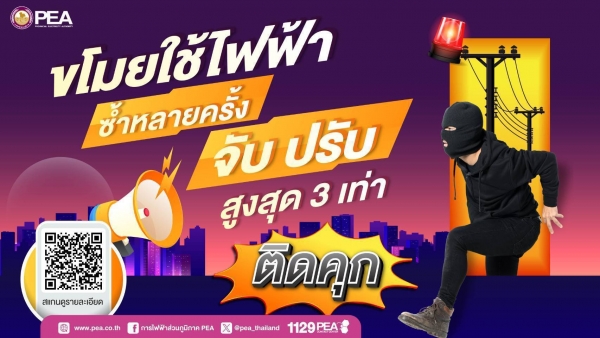 หากพบเห็นการลักลอบขโมยใช้ไฟฟ้า สายไฟและอุปกรณ์ไฟฟ้า แจ้งการไฟฟ้าส่วนภูมิภาคในพื้นที่ หรือโทร 1129 PEA Contact Center ตลอด 24 ชั่วโมง