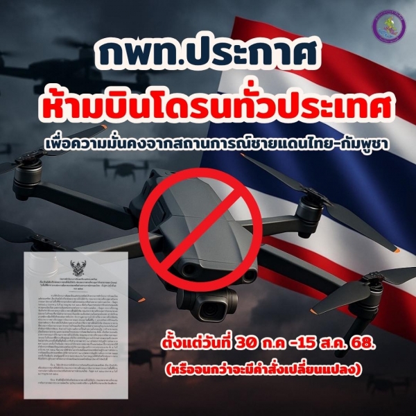 สำนักงานการบินพลเรือนแห่งประเทศไทย (กพท.) หรือ CAAT ออกประกาศด่วน ห้ามทำการบินหรือปล่อยอากาศยานซึ่งไม่มีนักบิน (โดรน) ทุกประเภทในพื้นที่ทั่วประเทศ โดยมีผลตั้งแต่วันที่ 30 กรกฎาคม 2568 จนถึงวันที่ 15 สิงหาคม 2568 หรือจนกว่าจะมีคำสั่งเปลี่ยนแปลง