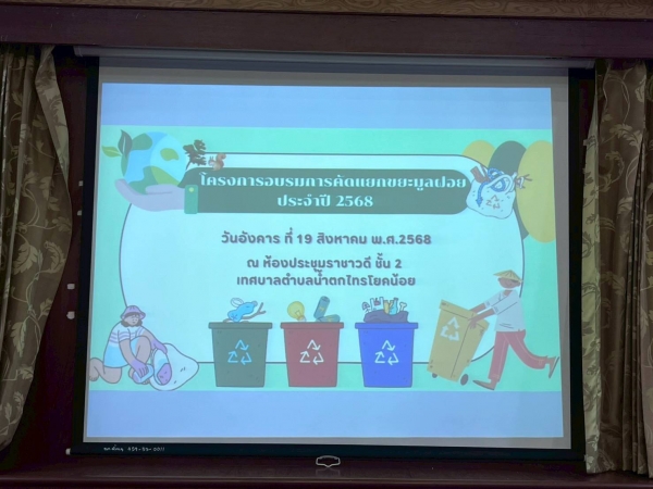 โครงการอบรมการคัดแยกขยะมูลฝอย ประจำปี 2568 วันอังคาร ที่ 19 สิงหาคม 2568 เวลา 08.30 น. ณ ห้องประชุมราชาวดีชั้น 2 นางสุนัน แสนสม รองนายกเทศมนตรีตำบลน้ำตกไทรโยคน้อย เป็นประธานในพิธีเปิดโครงการ พร้อมด้วยคณะผู้บริหาร สมาชิกสภาเทศบาล หัวหน้าส่วน และเจ้าหน้าที่ที่เกี่ยวข้อง โดยมีกลุ่มเป้าหมายคือ ประชาชนทั้ง 6 ชุมชน ตัวแทนกลุ่ม อสม. จำนวน 60 คน