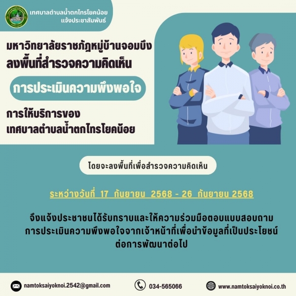 เทศบาลตำบลน้ำตกไทรโยคน้อย แจ้งประชาสัมพันธ์ เนื่องจากระหว่างวันที่ 17 กันยายน 2568 ถึงวันที่ 26 กันยายน 2568 จะมีเจ้าหน้าที่ของมหาวิทยาลัยราชภัฏหมู่บ้านจอมบึง จังหวัดราชบุรี ลงพื้นที่สำรวจความคิดเห็นการประเมินความพึงพอใจการให้บริการของเทศบาลตำบลน้ำตกไทรโยคน้อย