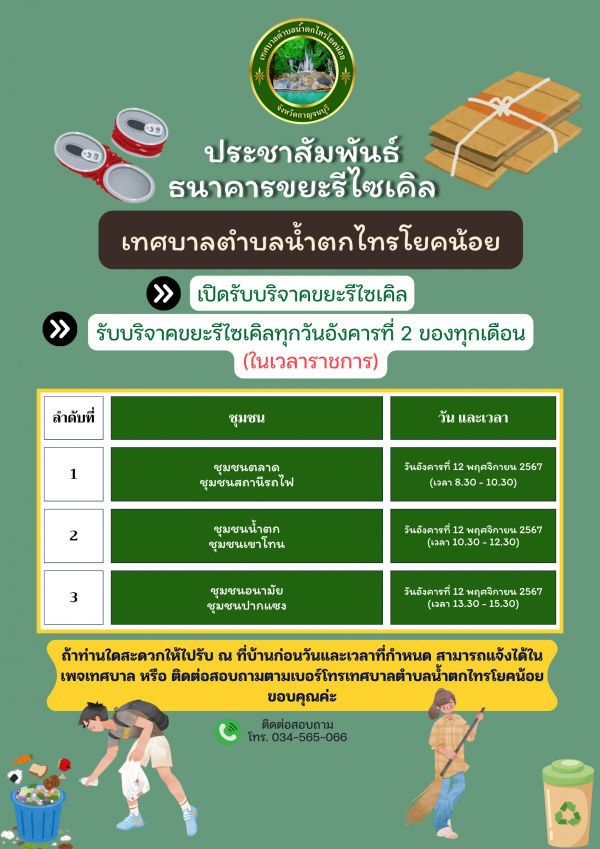 เปิดรับบริจาคขยะรีไซเคิล ธนาคารขยะรีไซเคิล เทศบาลตำบลน้ำตกไทรโยคน้อย ณ วันอังคารที่ 12 พฤศจิกายน 2567 ณ เทศบาลตำบลน้ำตกไทรโยคน้อยท่านใดไม่สะดวกสามารถโทรติดต่อ 034-565066 งานสาธารณสุขสำนักปลัดเทศบาล