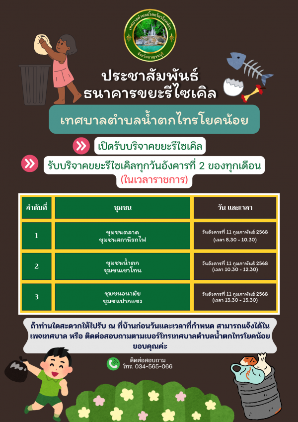 เปิดรับบริจาคขยะรีไซเคิล ธนาคารขยะรีไซเคิล เทศบาลตำบลน้ำตกไทรโยคน้อย ณ วันอังคารที่ 11 กุมภาพันธ์ 2568 ณ เทศบาลตำบลน้ำตกไทรโยคน้อยท่านใดไม่สะดวกสามารถโทรติดต่อ 034-565066 งานสาธารณสุขสำนักปลัดเทศบาล