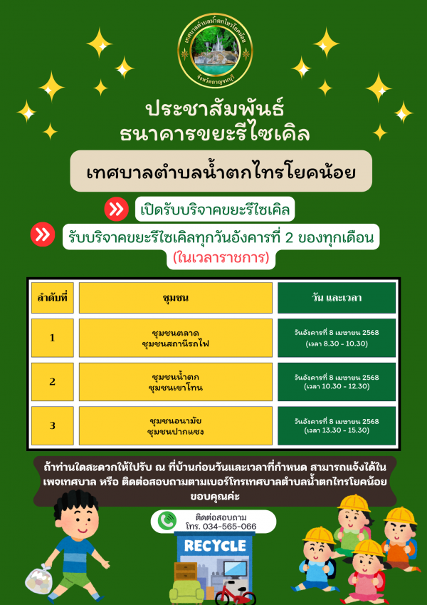 เปิดรับบริจาคขยะรีไซเคิล ธนาคารขยะรีไซเคิล เทศบาลตำบลน้ำตกไทรโยคน้อย ณ วันอังคารที่ 8 เมษายน 2568 ณ เทศบาลตำบลน้ำตกไทรโยคน้อยท่านใดไม่สะดวกสามารถโทรติดต่อ 034-565066 งานสาธารณสุขสำนักปลัดเทศบาล