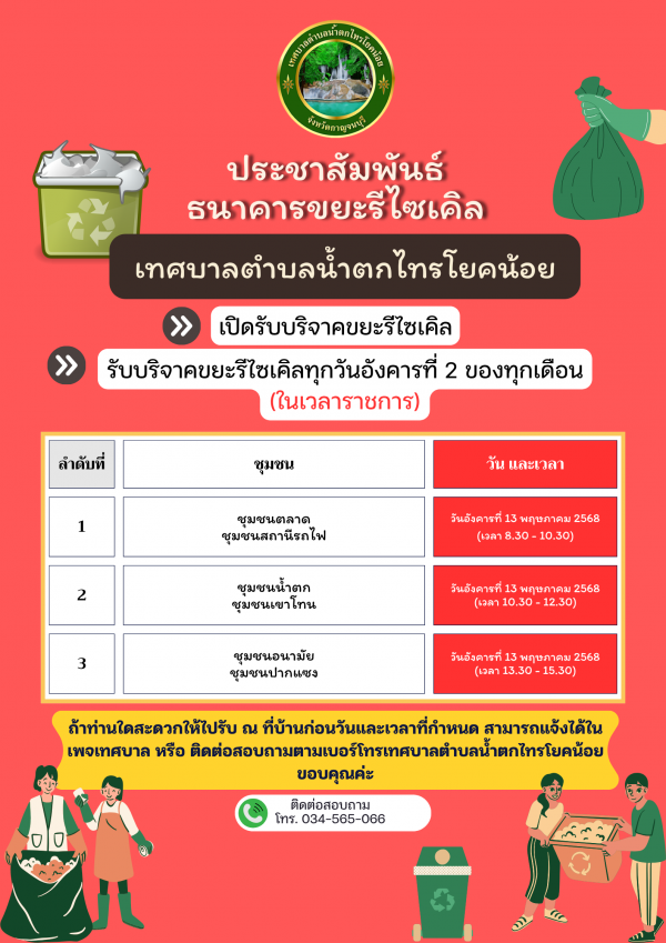 เปิดรับบริจาคขยะรีไซเคิล ธนาคารขยะรีไซเคิล เทศบาลตำบลน้ำตกไทรโยคน้อย ณ วันอังคารที่ 13 พฤษภาคม 2568 ณ เทศบาลตำบลน้ำตกไทรโยคน้อยท่านใดไม่สะดวกสามารถโทรติดต่อ 034-565066 งานสาธารณสุขสำนักปลัดเทศบาล