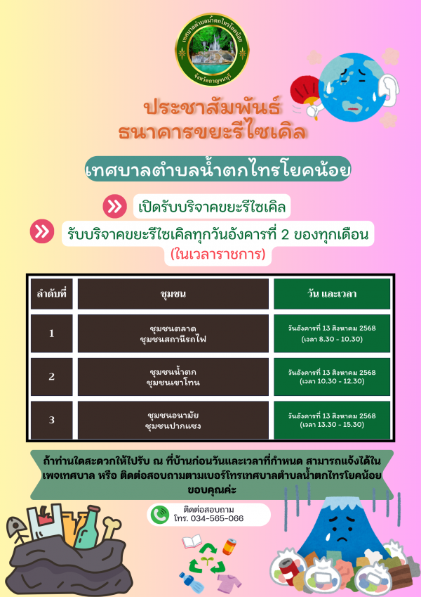 เปิดรับบริจาคขยะรีไซเคิล ธนาคารขยะรีไซเคิล เทศบาลตำบลน้ำตกไทรโยคน้อย ณ วันอังคารที่ 13 สิงหาคม 2568 ณ เทศบาลตำบลน้ำตกไทรโยคน้อยท่านใดไม่สะดวกสามารถโทรติดต่อ 034-565066 งานสาธารณสุขสำนักปลัดเทศบาล