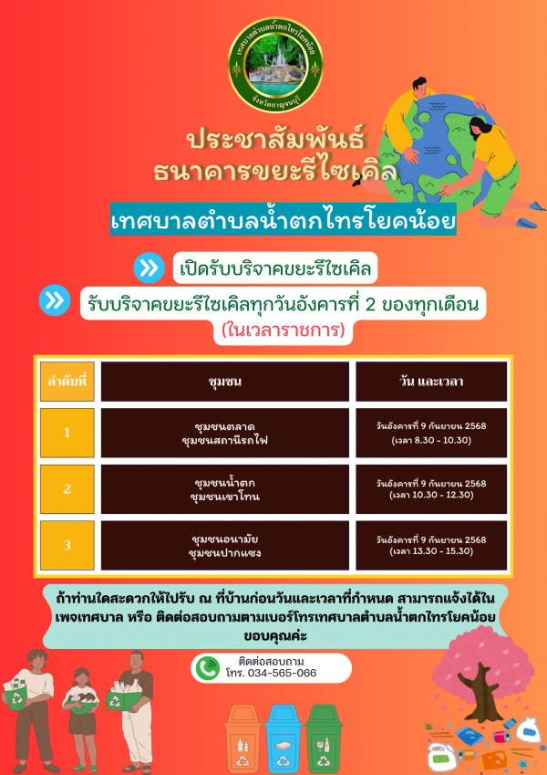 เปิดรับบริจาคขยะรีไซเคิล ธนาคารขยะรีไซเคิล เทศบาลตำบลน้ำตกไทรโยคน้อย ณ วันอังคารที่ 9 กันยายน 2568 ณ เทศบาลตำบลน้ำตกไทรโยคน้อยท่านใดไม่สะดวกสามารถโทรติดต่อ 034-565066 งานสาธารณสุขสำนักปลัดเทศบาล