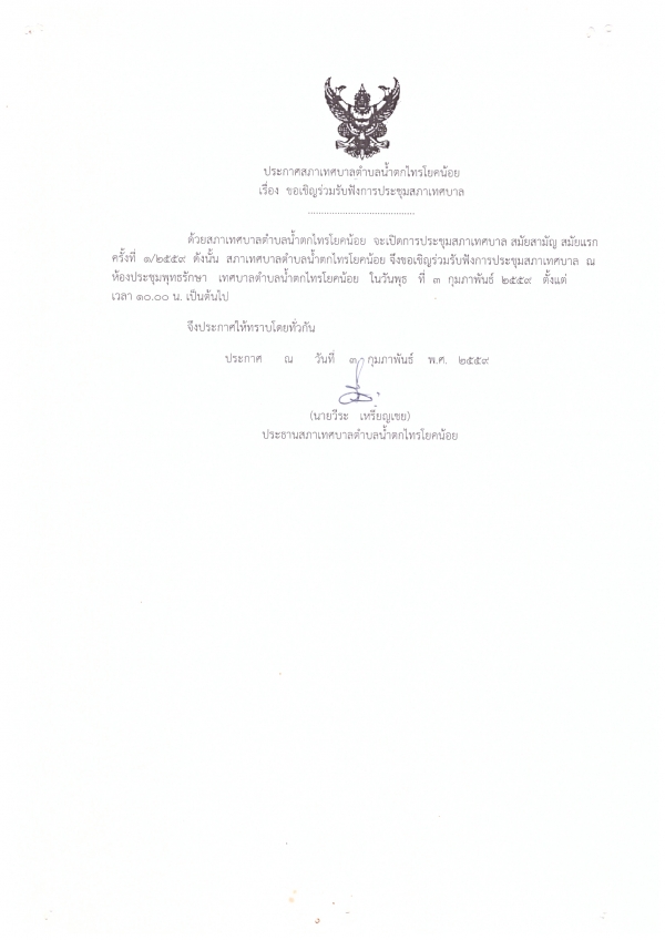 ด้วยสภาเทศบาลตำบลน้ำตกไทรโยคน้อย จะเปิดการประชุมสภาเทศบาล สมัยสามัญ สมัญแรก ครั้งที่ 1/2559 จึงขอเชิญชวนผู้ที่สนใจเข้าร่วมรับฟังการประชุมสภาเทศบาล ณ ห้องประชุมพุทธรักษา เทศบาลตำบลน้ำตกไทรโยคน้อย ในวันพุธ ที่ 3 กุมภาพันธ์ 2559 เวลา 10.00 น.เป็นต้นไป