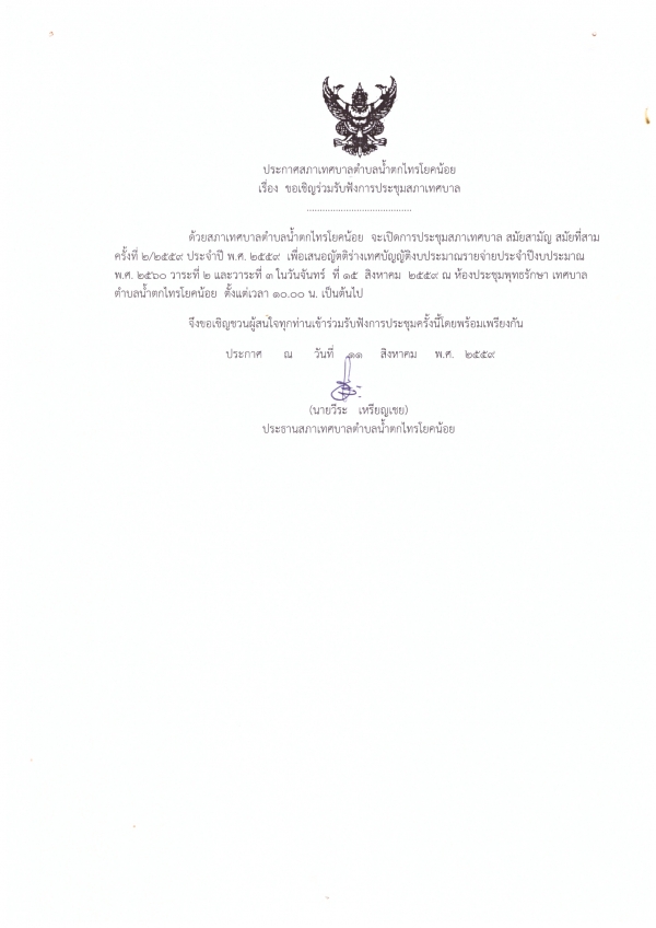 ด้วยสภาเทศบาลตำบลน้ำตกไทรโยคน้อย จะเปิดการประชุมสภาเทศบาล สมัยสามัญ สมัยที่สาม ครั้งที่ 2/2559 ประจำปี พ.ศ. 2559 เพื่อเสนอร่างเทศบัญญัติรายจ่ายประจำปีงบประมาณ 2560 วาระที่ 2 และวาระที่ 3 ดังนั้นจึงขอเชิญร่วมรับฟังการประชุมสภาเทศบาล ณ ห้องประชุมพุทธรักษา ในวันจันทร์ ที่ 15 สิงหาคม 2559 ตั้งแต่เวลา 10.00 น. เป็นต้นไป