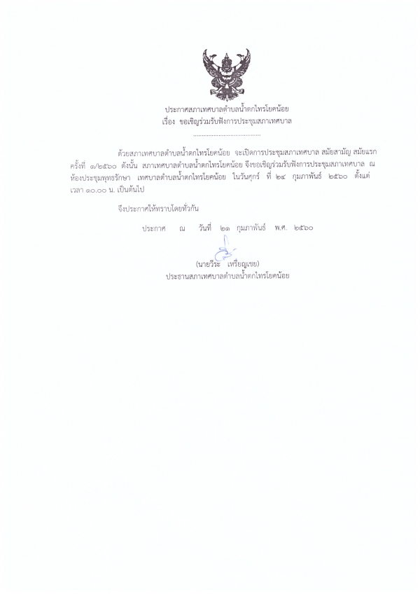 ด้วยสภาเทศบาลตำบลน้ำตกไทรโยคน้อย จะเปิดการประชุมสภาเทศบาล สมัยสามัญ สมัยแรก ครั้งที่ 1/2560 ดังนั้นจึงขอเชิญร่วมรับฟังการประชุมสภาเทศบาล ณ ห้องประชุมพุทธรักษา ในวันศุกร์ ที่ 24 กุมภาพันธ์ 2560 ตั้งแต่เวลา 10.00 น. เป็นต้นไป
