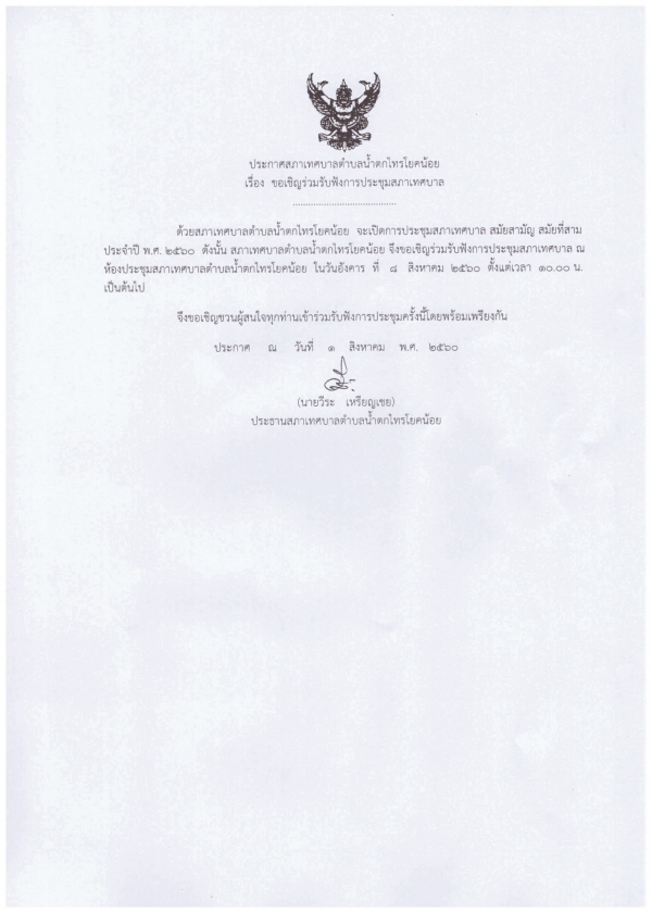 เทศบาลตำบลน้ำตกไทรโยคน้อย ขอเชิญร่วมรับฟังการประชุมสภาเทศบาล ในวันอังคาร ที่ 8 สิงหาคม 2560 ตั้งแต่เวลา 10.00 น. ณ ห้องประชุมสภาเทศบาลตำบลน้ำตกไทรโยคน้อย