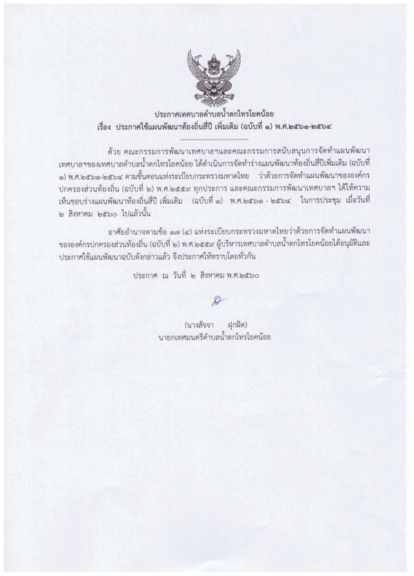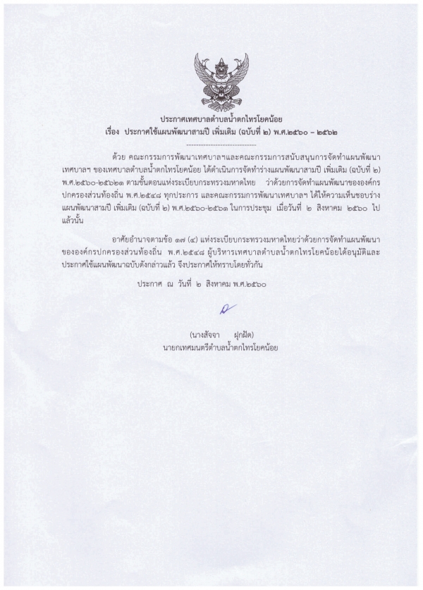 เทศบาลตำบลน้ำตกไทรโยคน้อย ขอแจ้งประชาสัมพันธ์ เรื่อง ประกาศใช้แผนพัฒนาท้องถิ่นสี่ปี เพิ่มเติม (ฉบับที่ 1) พ.ศ.2561-2564 และ เรื่อง ประการใช้แผนพัฒนาสามปี เพิ่มเติม (ฉบับที่ 2) พ.ศ.2560-2562 ประกาศ ณ วันที่ 2 สิงหาคม 2560 จึงขอประกาศมาให้ทราบโดยทั่วกัน