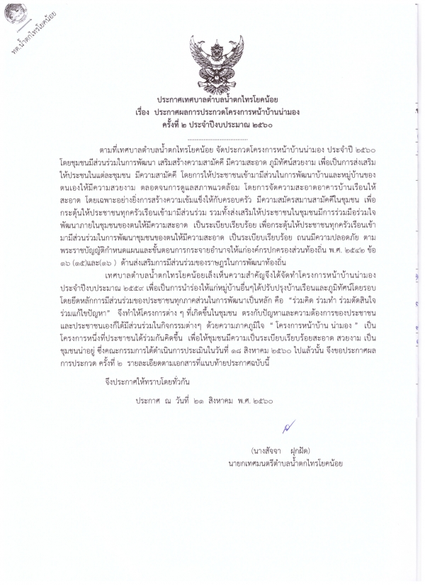 ประกาศผลการประกวดโครงการหน้าบ้านน่ามอง ครั้งที่ 2 ประจำปี พ.ศ.2560