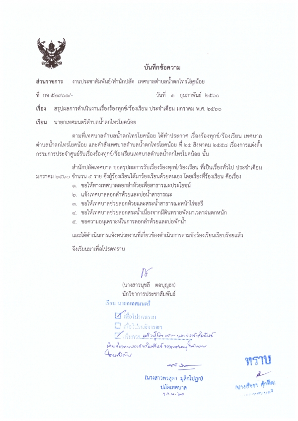 สรุปผลการดำเนินงานเรื่องร้องร้องทุกข์/ร้องเรียน ประจำเดือน มกราคม 2560