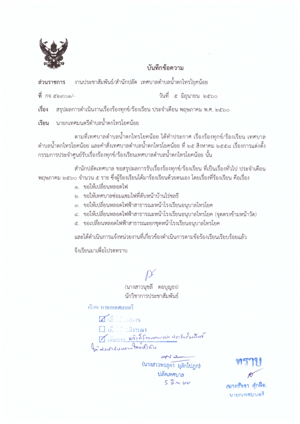 สรุปผลการดำเนินงานเรื่องร้องร้องทุกข์/ร้องเรียน ประจำเดือน พฤษภาคม 2560