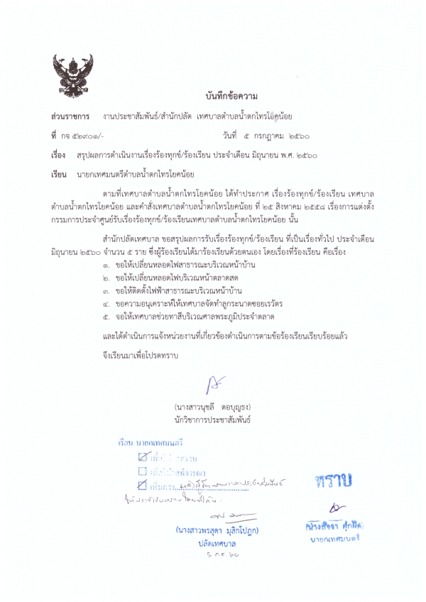 สรุปผลการดำเนินงานเรื่องร้องร้องทุกข์/ร้องเรียน ประจำเดือน มิถุนายน 2560