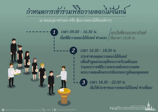 ข้อควรปฏิบัติ-การแต่งกายประชาชน สำหรับการเข้าร่วมพิธีถวายดอกไม้จันทน์ ในหลวงรัชกาลที่ ๙ ทั้งที่ท้องสนามหลวงและสถานที่วางดอกไม้จันทน์ที่กระจายทุกจุดทุกจังหวัด โดยพระเมรุมาศจำลอง และสถานที่วางดอกไม้จันทน์ จะมีการติดตั้งจอโทรทัศน์ขนาดใหญ่ไว้ เพื่อจะได้เห็นการดำเนินพระราชพิธีในกรุงเทพมหานคร ให้มีบรรยากาศเหมือนกับส่วนกลางมากที่สุด กำหนดการ สำหรับอำเภอไทรโยค จัดซุ้มถวายดอกไม้จันทน์ ณ วัดน้ำตก เริ่มตั้งแต่ เวลา 09.00 น. เป็นต้นไป จึงขอเชิญชวนประชาชนได้เข้าร่วมในพิธีถวายดอกไม้จันทน์โดยพร้อมเพรียงกัน