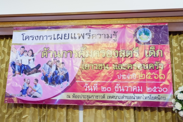 20 ธันวาคม 2560 เวลา 09.00 น. เทศบาลตำบลน้ำตกไทรโยคน้อย จัดอบรม "โครงการเผยแพร่ให้ความรู้ด้านการคุ้มครองสตรี เด็ก เยาวชน และครอบครัว ประจำปี2561" โดยมีนางสัจจา ฝุกฝัด นายกเทศมนตรี เป็นประธานกล่าวเปิดการอบรมและมีเยาวชนจากโรงเรียนไทรโยคน้อยวิทยา กลุ่มอสม. เทศบาลฯ คณะกรรมการชุมชนเข้ารับการอบรม ณ ห้องประชุมราชาวดี เทศบาลตำบลน้ำตกไทรโยคน้อย