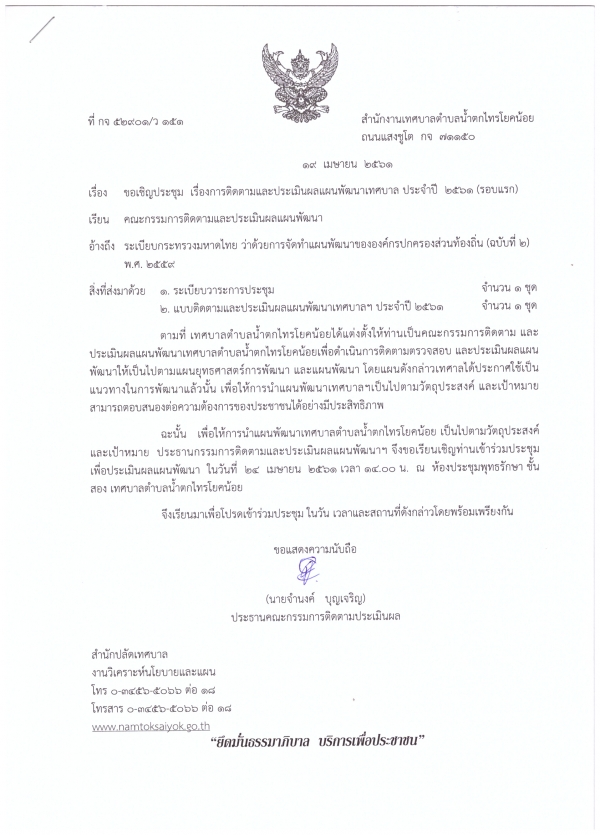 ขอเชิญประชุม เรื่องการติดตามและประเมินผลแผนพัฒนาเทศบาล ประจำปี 2561 (รอบแรก)