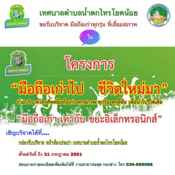 เทศบาลตำบลน้ำตกไทรโยคน้อย ขอแจ้งประชาสัมพันธ์โครงการ "มือถือเก่าไป ชีวิตใหม่มา เพื่อมอบหนังสือให้ศูนย์พัฒนาเด็กเล็ก" โดยขอรับบริจาคมือถือเก่า ทุกรุ่น ทุกสภาพ ทุกยี่ห้อ เพื่อช่วยลดอันตรายจากขยะอิเล็กทรอนิกส์ในครัวเรือน โดยรายได้จากการรีไซเคิลไปจัดหาหนังสือสำหรับเด็กและสื่อเพื่อการศึกษาอื่นๆ มอบให้ศูนย์พัฒนาเด็กเล็กขององค์กรปกครองส่วนท้องถิ่นที่ขาดแคลนในถิ่นทุรกันดาร จำนวน 1,000 แห่ง สามารถนำมาบริจาคได้ที่กล่องรับบริจาค บริเวณหน้าห้องประปา เทศบาลตำบลน้ำตกไทรโยคน้อย ได้ตั้งแต่บัดนี้เป็นต้นไป ถึงวันที่ 31 กรกฎาคม 2561 จึงขอแจ้งประชาสัมพันธ์มารให้ทราบโดยทั่วกัน