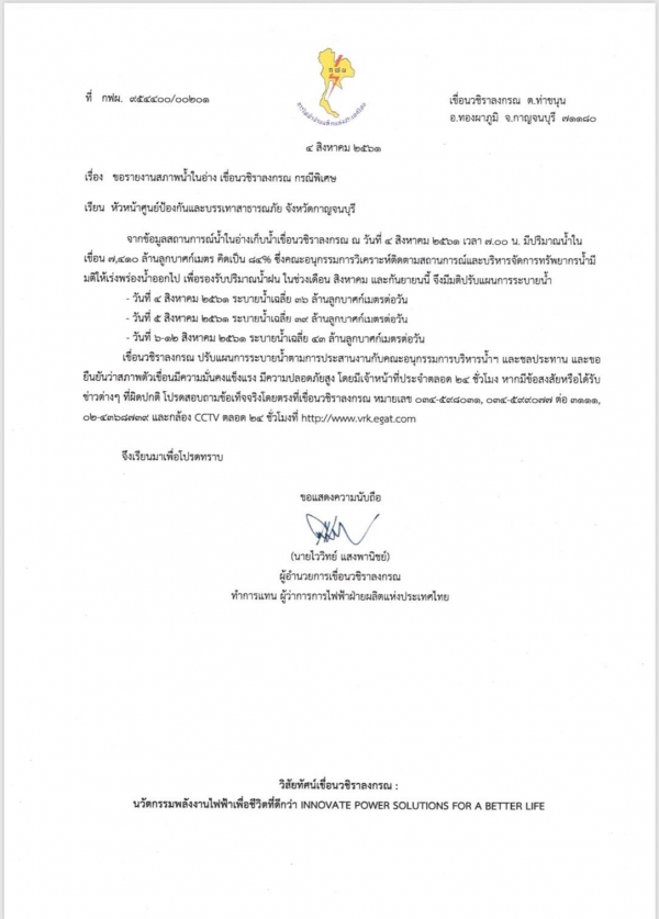 เขื่อนวชิราลงกรณ แจ้งปรับเพิ่มการระบายน้ำในเขื่อนวชิราลงกรณ
