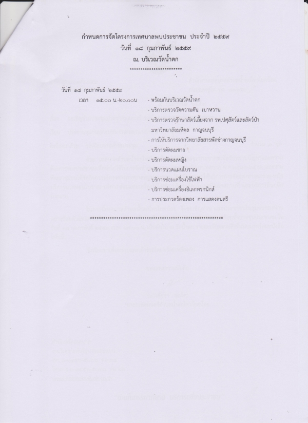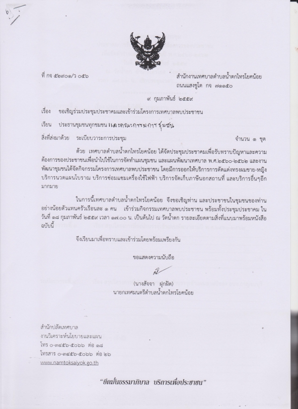 จึงขอเชิญท่าน และประชาชนในชุมชนอย่างน้อยตัวแทนครัวเรือนล่ะ 1 คน เข้าร่วมกิจกรรมเทศบาลพบประชาชน พร้อมทั้งประชุมประชาคมในวันที่ 18 กุมภาพันธ์ 2559 เวลา 17.00 น. เป็นต้นไป ณ วัดน้ำตก