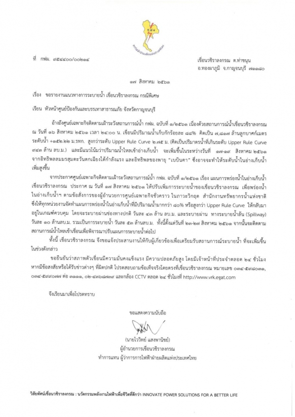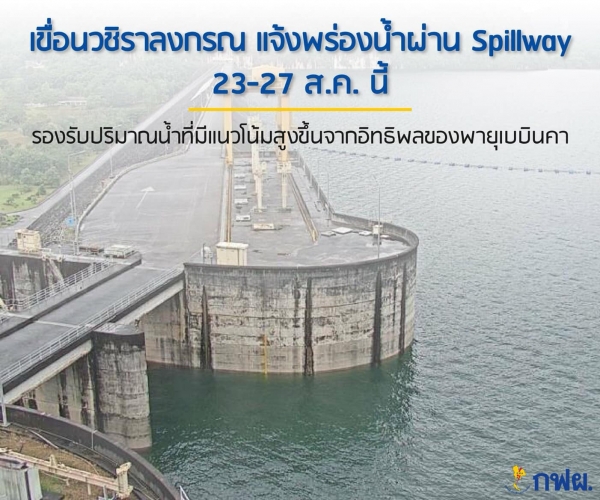 เขื่อนวชิราลงกรณ แจ้งพร่องน้ำผ่าน Spillway ระหว่าง 23-27 ส.ค. นี้รองรับปริมาณน้ำที่มีแนวโน้มสูงขึ้นจากอิทธิพลของพายุเบบินคา![]()