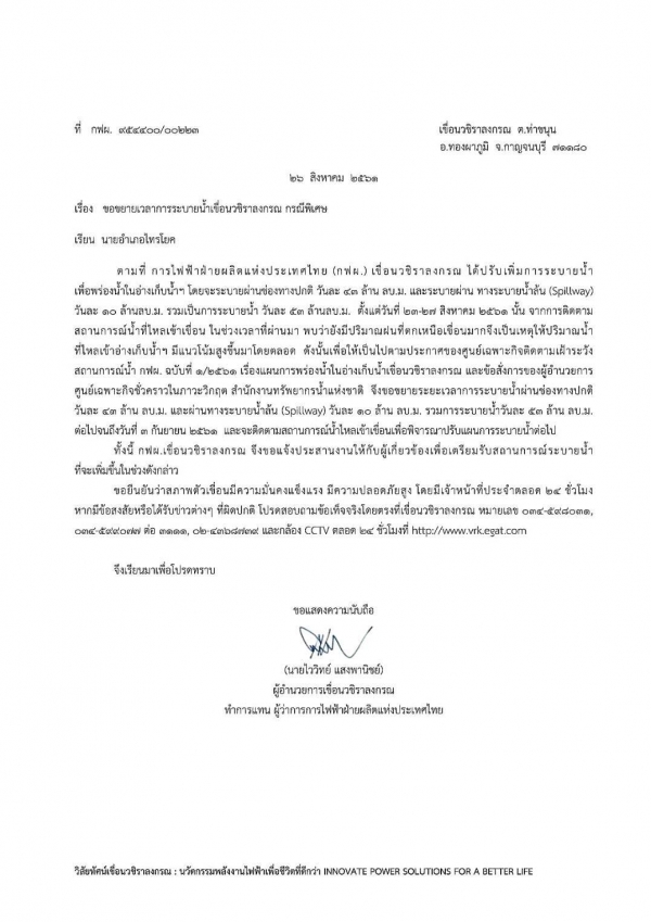 แจ้งประชาสัมพันธ์การขยายเวลาการระบายน้ำเขื่อนวชิราลงกรณ์ กรณีพิเศษ